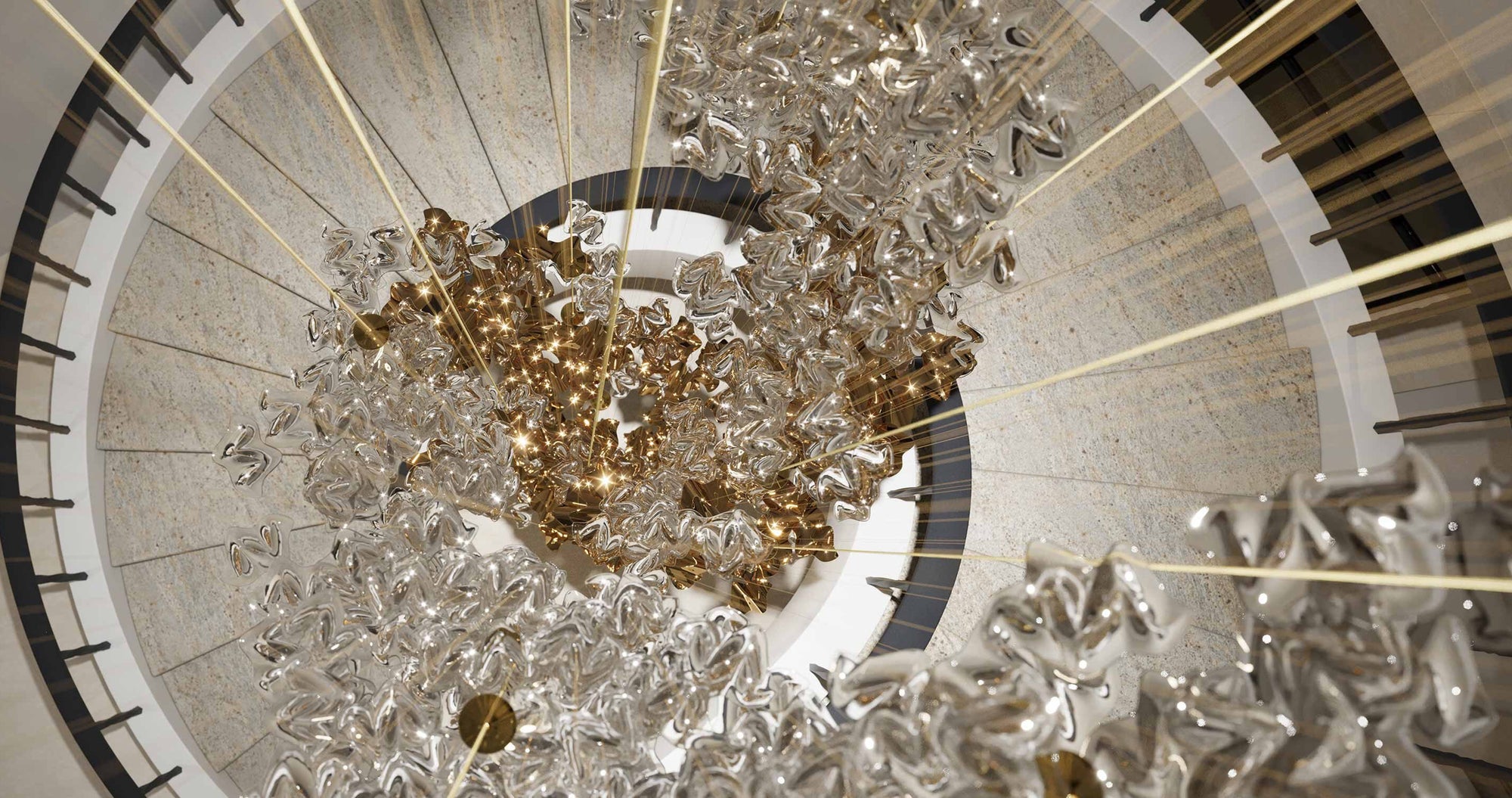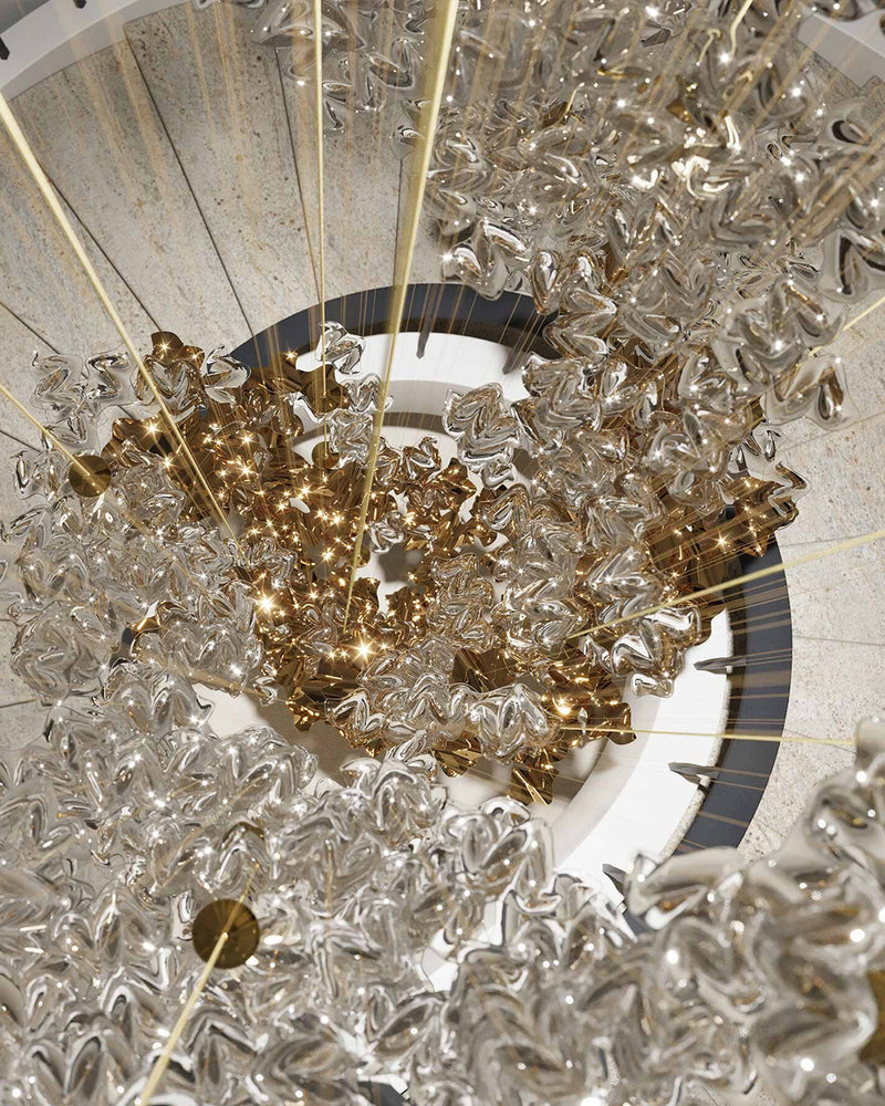 mooiehomeFontaine vertical's playful forms add dimension and movement to the space. The unique design features eight linen lampshades hanging from a layer...