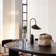 The gentle curves mimic the natural curvature of a bent reed, while the matte black finish and clean lines evoke the sophistication of contemporary art. The solid round base provides a sense of grounding, echoing the weight and permanence of marble, while the slim curves and tapered shade evoke a delicate sense of balance and refinement. This lamp is more than a light source; it’s a statement piece that seamlessly blends art and function.
