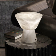 The Beta Table Lamp offers an elegant statement piece for any room. Crafted with two conical shapes separated by a delicate gilt-brass trim, its contemporary and timeless design emits a soft, warm glow to highlight the intricate beauty of alabaster.