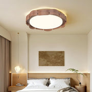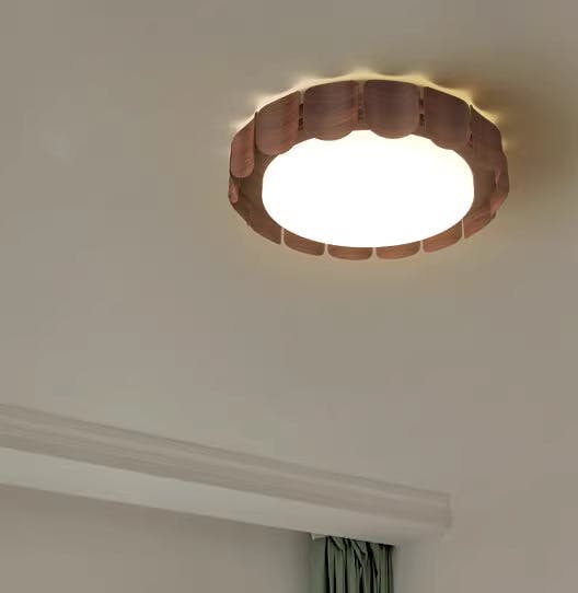 The Cascadia Flare Ceiling Light elegantly combines modern aesthetics with functional brilliance. Crafted with precision, this light fixture features a distinctive array of curved metal panels finished with a walnut wood grain effect through advanced hydrographic printing techniques.