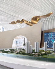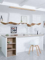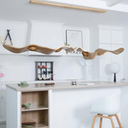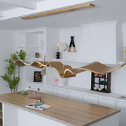 "Gold Ribbons" all have their own unique expressions and shapes. It is made from two sections of aluminum, formed by hand. There is a light source inside the body that emits light through the opening. Light makes the surface glow, while varying levels of brightness accentuate the flowing shapes of the ribbons.