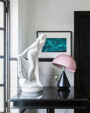 The Divina Table Lamp from Mooiehome is a playful expression of modern geometry and minimalist charm. Expertly crafted from durable iron, this lamp features a bold conical base in matte black, supporting a softly curved dome shade in a gentle pink tone. A whimsical green dotted switch adds a touch of character and artistic flair.Designed to be both functional and visually striking, the Divina Table Lamp brings warm, focused light to your workspace, bedside, or reading corner. Its sculptural form makes it a conversation piece even when turned off, perfect for contemporary and creative interiors.