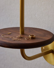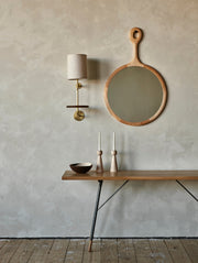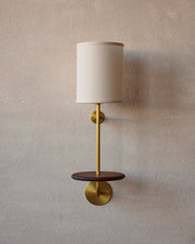 The Haven wall lamp is the perfect blend of elegance and functionality, ideal for modern interiors. With its simple brass arm and warm fabric drum shade, this wall lamp casts a cosy mood light, perfect for a bedroom, hallway or reading nook. The integrated wooden shelf adds a practical touch, providing a handy space for small items such as books, glasses or your favourite decorative items.