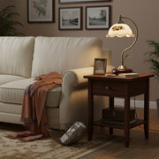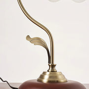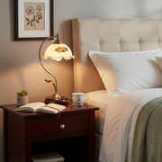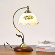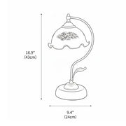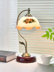 This elegant vintage table lamp features a beautiful glass lampshade adorned with charming floral patterns, emitting a soft and romantic glow when lit. Its curved iron body and sturdy wooden base perfectly blend classic Victorian charm with timeless sophistication.