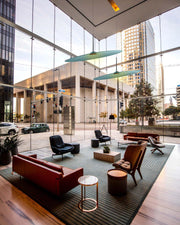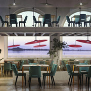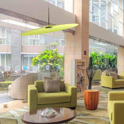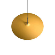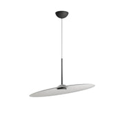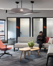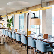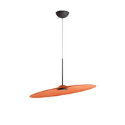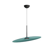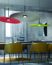 Inspired by a drum plate, the large, thin lampshade subverts its concept, absorbing ambient sound and creating a high level of acoustic comfort. Its naturally inclined position and lightness allow for dynamic and creative lamp arrangements.