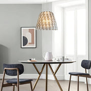 Inspired by the delicate beauty of feathers, the Feathered Elegance Pendant Light features an intricate design that mimics the layered texture of feathers. Each translucent piece is carefully arranged to create a stunning, shimmering effect when illuminated. This pendant light brings a touch of natural grace and sophisticated charm to any space, making it a perfect centerpiece for contemporary and eclectic interiors.