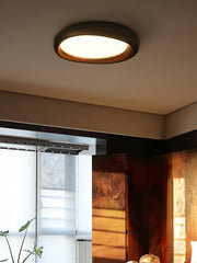 The smooth oval shape features a natural wood grain, perfectly blending organic design with modern design. The soft light emitted by its central lamp is evenly spread, creating a warm and welcoming atmosphere throughout the room. Its timeless design makes it suitable for both modern and traditional decorations, providing a practical and stylish lighting solution.