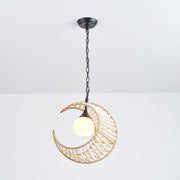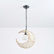 The Moon Crown Chandelier features a crescent shape wrapped in a woven design. Its design captures the mystery and tranquility of moonlight, blending natural materials with soothing ambient light. Perfect for adding a touch of organic elegance to any room, this lamp promises to be a conversation centerpiece, emitting a warm and inviting glow reminiscent of a peaceful night under the stars.