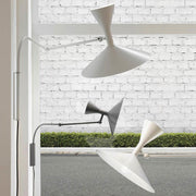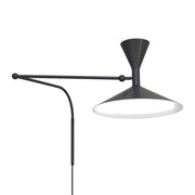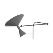 This adjustable wall light has two connectors on the arm and a swivel wall fixing. A mini version with reduced dimensions is also available. Spun aluminum diffuser. Available in matte grey, white or black body with white internal diffuser. Direct and indirect lighting output. There are dual switches on the cable for functionality and adjustable light output.