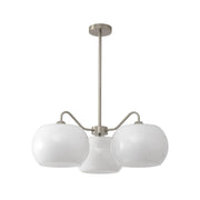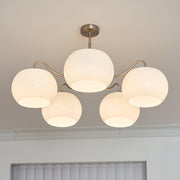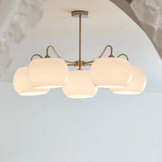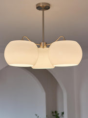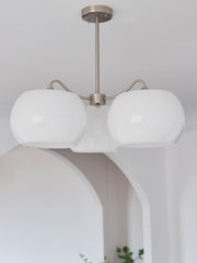 The Moricio Chandelier is a stunning fixture that blends classic style with modern light. Its candelabra-inspired design coupled with white glass shades creates a sophisticated and luxurious feel, while providing a bright, well-lit atmosphere.