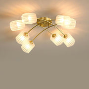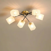 A graceful arched arm supports an elegant ribbed glass shade. The design evokes a sense of tranquility and balance, casting a warm, inviting glow throughout the room.