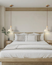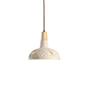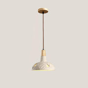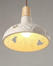 Inspired by cement textures and organic shapes, this pendant lamp features a handcrafted concrete shade with an intricately carved pattern and a wooden top. This design brings a rustic yet modern touch to interiors, perfect for creating a warm, inviting ambiance in a dining room, kitchen or cozy nook.