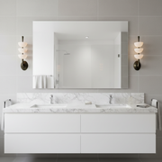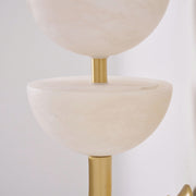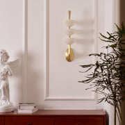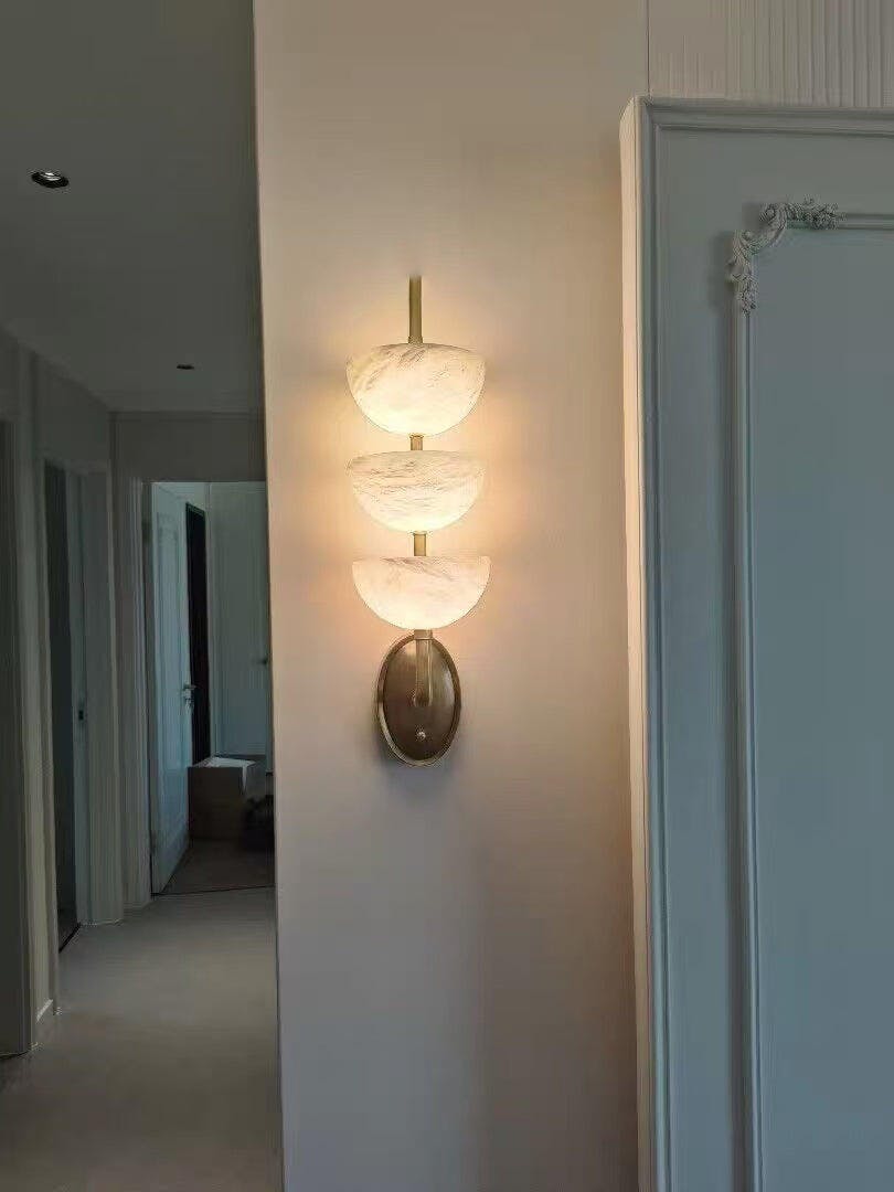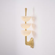 The Triple Alabaster Wall Sconce exudes elegance with its blend of snowflake stone and metal. Featuring three beautifully crafted alabaster shades, this sconce emits a soft, diffused light that creates a serene ambiance. The brass metal frame complements the natural patterns of the alabaster, making it a stylish and sophisticated addition to any room. Inspired by the timeless beauty of alabaster and the warmth of brass, this sconce is perfect for enhancing hallways, living rooms, or bedrooms with a touch of luxury and tranquility.