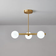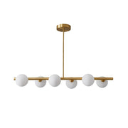 The Castell Chandelier is a statement-making fixture that blends mid-century style with modern technology. It features six frosted glass globes suspended along a striking central bar. The warm aged brass finish creates a sophisticated look, perfect for a living room, dining room, or kitchen island.