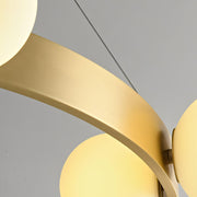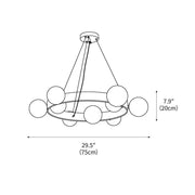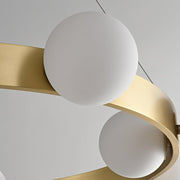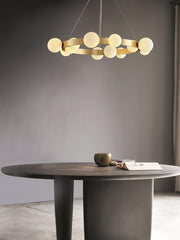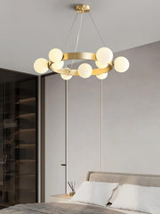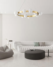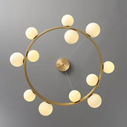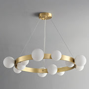 The Cinema Chandelier makes a bold statement with minimal effort, featuring a simple circular frame in a rich metal or powder-coated finish embellished by the warm glow of opal glass fixtures.