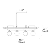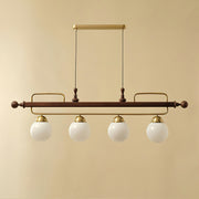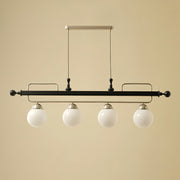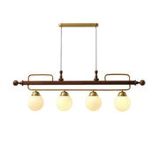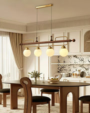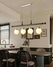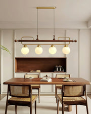 The Quad Sphere Pendant is designed with four perfectly symmetrical circular lampshades, like four planets hanging in the air, creating a modern and simple visual aesthetic. The metal bracket and wooden material details of the lamp add an industrial texture to it, while the warm light brings a soft atmosphere to the room.