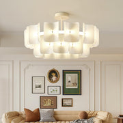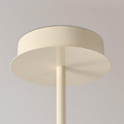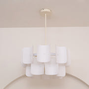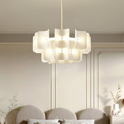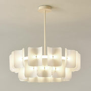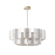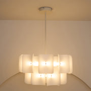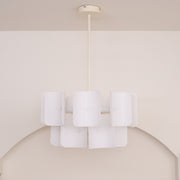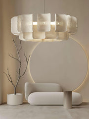 Set within a handcrafted metal halo that is effortlessly suspended, a series of handmade slabs of white acrylic sheet with abstract swirls captured in their forms are set vertically within this frame. Its distinctive pattern variation brings an organic touch to the design as LED light guides within the circular frame cast a layer of illumination up and down these elements and their surroundings.