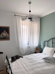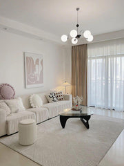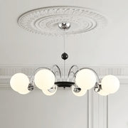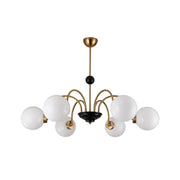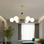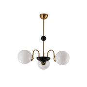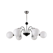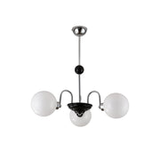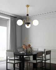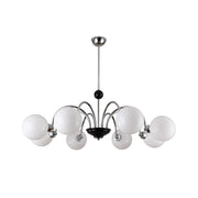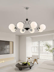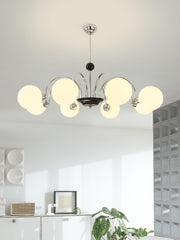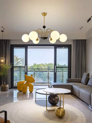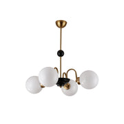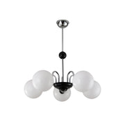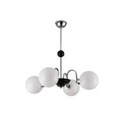 This Yisu Chandelier adds a modern, eye-catching touch to any living space. The black frame is made up of angular rods for a unique design, while the vintage-style white glass globes provide a soft, welcoming diffusion of light. Perfect for a Mid-Century Modern or upscale loft setting.