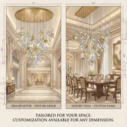 Experience the grandeur of our customizable Leaf Chandelier. Made of anodized gold aluminum, it radiates a warm glow upwards while casting intricate shadows. The integrated LED lights make the brushed finish shimmer in golden tones. With narrow spotlights on the ceiling, it's like walking through a sun-dappled forest.