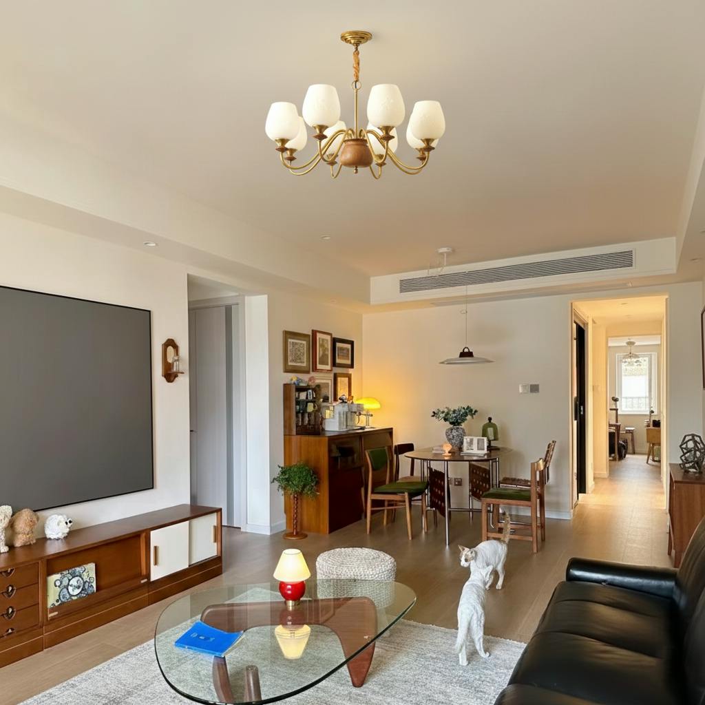 The rich wooden centre section evokes the warmth of a forest, while the elegantly curved metal arms add a touch of sophistication. The frosted glass lampshade, embellished with delicate floral carvings, softly diffuses the light, creating a cosy and inviting ambience.