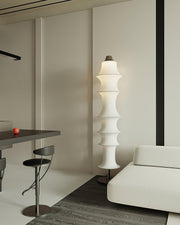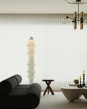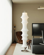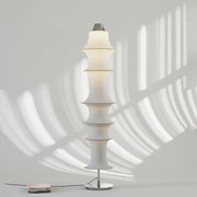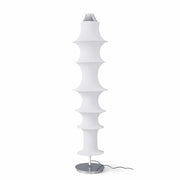 It is a lamp with a spontaneous shape achieved through the contrasting forces of its components: the tension of a finely woven fabric stretch tube and the weight of seven aluminum rings of different sizes. Single light bulbs and aluminum reflectors illuminate the curves of the fabric.
