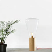 This lamp design combines elegant clear glass with a warm wood base to create a soft and inviting light. Its shape is like a guiding light that not only illuminates the surrounding space, but also adds a touch of art to modern homes, making it a focal point in any room.