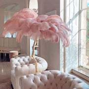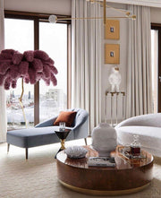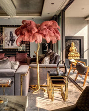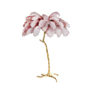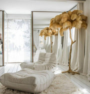 Decorate your room and complete it with a tropical-inspired tree shape Palmera floor lamp. The body is masterfully shaped to imitate the palm tree, and decorated with leaf-like ostrich feathers on top to create tropical motives in your space. Thanks to gaps between the feathers the light is filtered nicely to illuminate softly and warmly to create a cozy atmosphere.