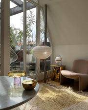 He took the design of these traditional lanterns for the occasion to create light sculptures made of wood and paper on his own. For the Akari Floor Lamp, the designer uses paper from the mulberry tree, because it softens the light, making it gentle and spreads it evenly.