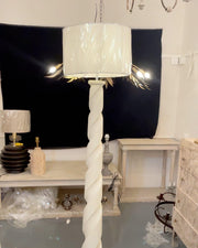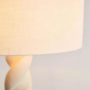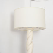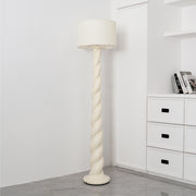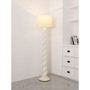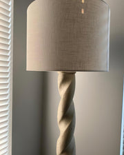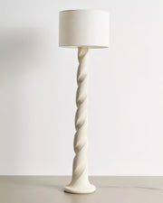 Light up your space with elegant whimsy when you display this twist-base floor lamp. Featuring a round base and twisting resin neck, topped with a woven drum shade. Plugs in to power on; compact fluorescent compatible.