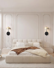 Modern poise with a sculptural edge. The Marla Wall Lamp from mooiehome blends bold material contrast with refined form. Its glossy black iron base anchors the design with contemporary sophistication, while the dome-shaped marble shade the silhouette with organic, creamy veining.