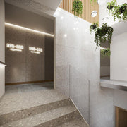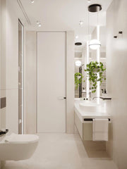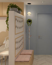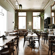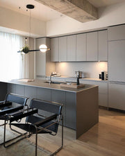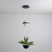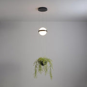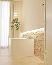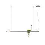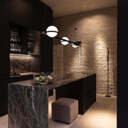 The classic globe, slightly flattened here evolves towards a more organic form and the suspended version with an almost imperceptible cable support accentuates the floating sensation.