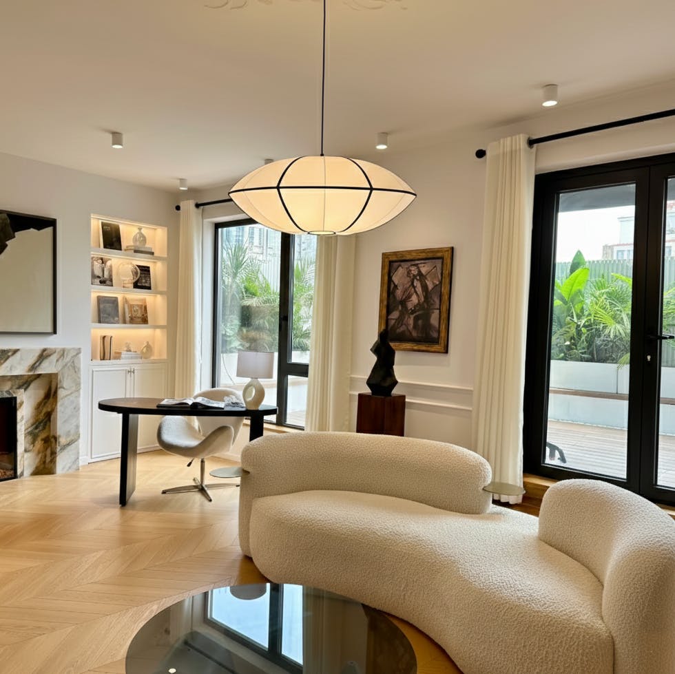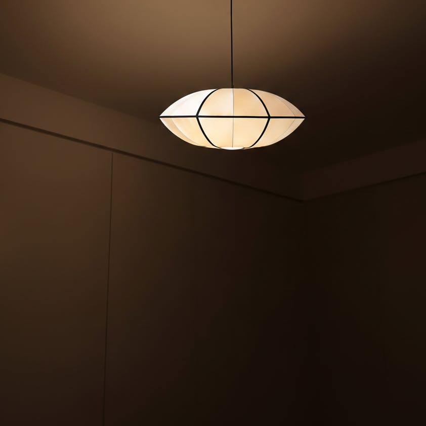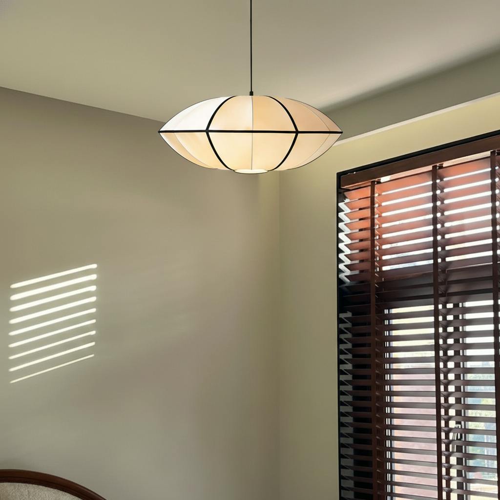 The Bombori pendant lamp is inspired by the understated beauty of traditional Japanese lanterns, bringing a sense of tranquility and modern elegance to any space. This unique pendant lamp features a fabric shade divided by simple black lines. This design evokes the serene beauty of paper lanterns, creating a subtle yet striking focal point.