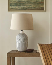 Blending modern design with timeless simplicity. The base features intricate black and white geometric lines for a striking visual contrast. Topped with a beige fabric shade, this table lamp is the perfect blend of artistry and practicality, adding a sophisticated touch to any room.