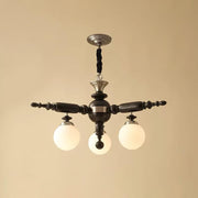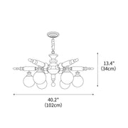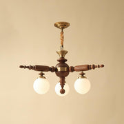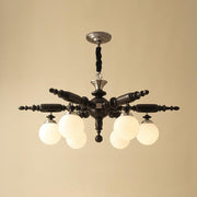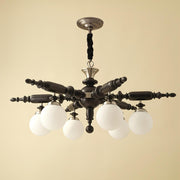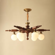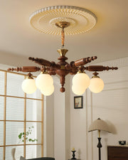 Combining elegant wood details with a modern sophistication, the symmetrical arrangement of wooden arms and opaline glass shades recalls the timeless beauty of a classic carousel horse, bringing a playful yet sophisticated aesthetic to any space.
