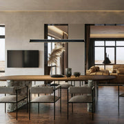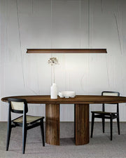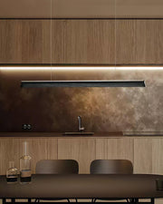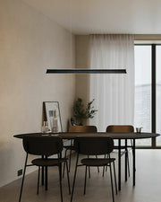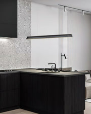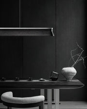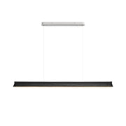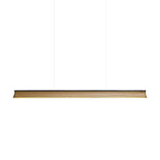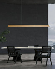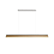 A sleek, minimalist lighting fixture perfect for modern interiors. Its streamlined wooden beam design exudes understated elegance, providing natural warmth while maintaining a modern aesthetic. Suspended by two nearly invisible cables, the pendant lamp creates a floating effect, perfect for spaces that require clean lines and unobtrusive lighting. The soft, diffused light from under the beam ensures even illumination, making it a great choice for dining areas, kitchens or office spaces.