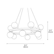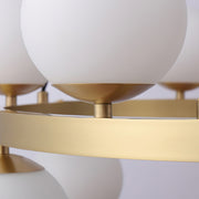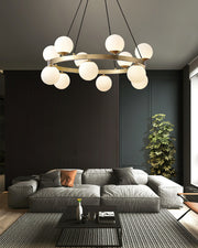The Camille Chandelier from mooiehome is a striking blend of sculptural elegance and modern sophistication. Crafted from lustrous brass and opal glass, this chandelier features a bold circular frame adorned with evenly spaced globe shades that emit a soft, ambient glow. Its geometric form and minimalist lines make it a stunning centerpiece for living rooms, lounges, or grand entryways. Suspended by sleek black cords, the Camille adds a sense of balance and drama to contemporary interiors—refined yet impactful.