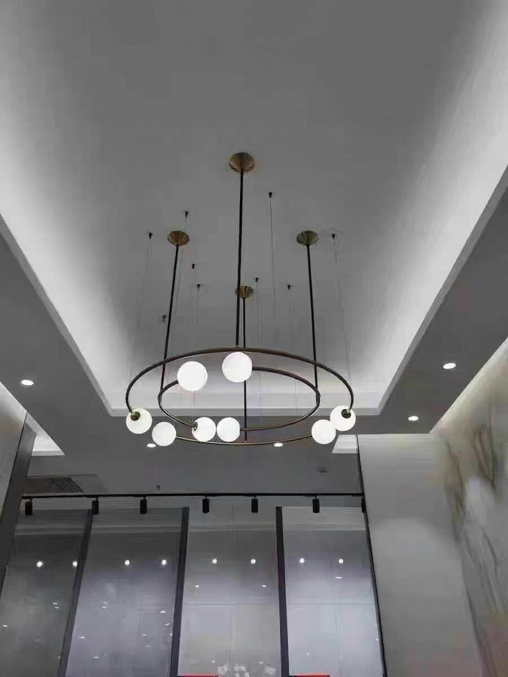 Oddments is an expandable system of arcs, available in a range of sizes that can outwardly expand across the horizontal plane, ascend vertically or interact playfully. Segments can be hung singularly or combined to create an open or closed system, unconfined by scale or surrounds. Made from iron and blown glass and hand finished to specification.