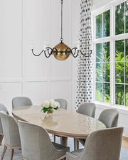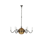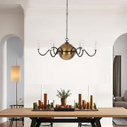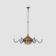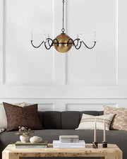 Classic form meets modern artistry in the Solenne Chandelier. Crafted from brass, its radiant central sphere anchors six gracefully curved arms, each supporting candle-style bulbs for a timeless, romantic glow. The contrast between the antique brass finish and matte black arms adds visual depth and a sophisticated edge. Ideal for dining rooms, foyers, or lofty interiors, the Solenne Chandelier brings refined warmth and architectural elegance to any space.