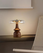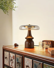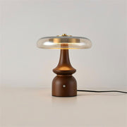 Experience a harmonious blend of vintage charm and modern elegance with the Nova Table Lamp. This striking piece features a sleek, Walnut Wood base that ascends into a distinctive, translucent glass shade, casting a warm, inviting glow. The unique mushroom-like silhouette and rich metallic accents make it a captivating addition to any contemporary or classic decor.