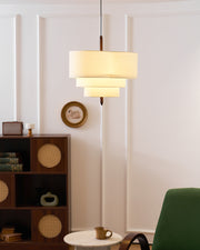 - White lampshade, walnut pole.