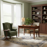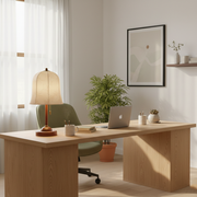 A printed fabric shade drapes over an elegant flared dome frame, softly filtering the light. The copper metal trim and black walnut-wrapped stem not only highlight the materiality, but also enhance the warm, natural feel of the lamp. We love placing it on a dresser or nightstand, as it makes the perfect bedside lamp.