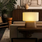Minimalist in form yet rich in character, the Habitat Table Lamp from Mooiehome offers a serene balance of design and function. Its solid wooden base tapers gently upward, grounding the piece with warmth and stability, while the softly glowing fabric shade floats above like a peaceful cloud.Blending natural textures with modern simplicity, this lamp brings quiet sophistication to any setting—whether placed on a bedside table, console, or reading nook. The subtle interplay between wood, metal, and fabric creates a harmonious ambiance that complements a wide range of interiors.