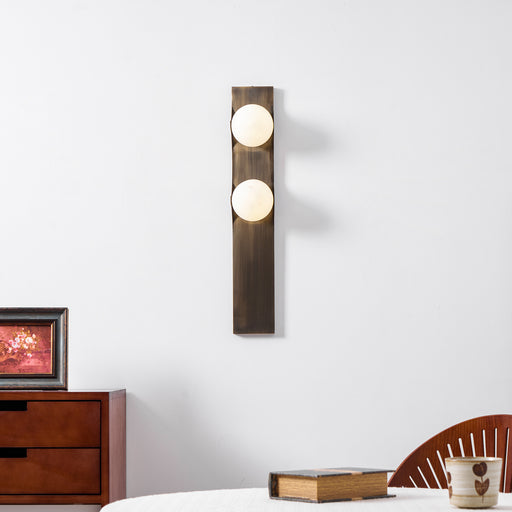 Elevate your interior ambiance with the Ember Line Wall Lamp – Mooiehome. Designed with a sleek brass frame and two glowing alabaster orbs, this s...
