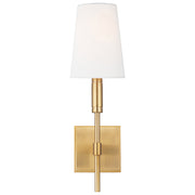 The Aurelia Wall Sconce radiates timeless elegance with its brushed brass structure and soft white fabric shade. The design features a square backplate paired with clean, geometric lines, creating a harmonious blend of classic and modern styles. Perfect for illuminating hallways, accenting bedrooms, or enhancing living spaces, this sconce delivers a warm, ambient glow that enriches any setting. A versatile and stylish addition to your interior lighting collection.