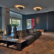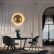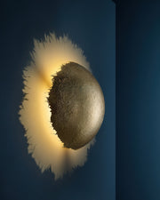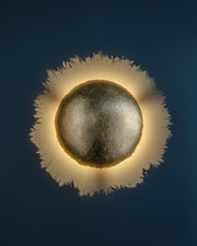 Boldly artistic and visually captivating, the PostKrisi Wall Lamp from Mooiehome is a masterpiece of sculptural lighting. Featuring a hand-crafted fiberglass shell with expressive, jagged edges and a radiant gold leaf core, it evokes the awe-inspiring energy of a solar eclipse。When illuminated, the lamp casts a dramatic halo of light that transforms any wall into a canvas of texture, shadow, and warmth. Mounted alone or in a series, the PostKrisi Wall Lamp is perfect for adding avant-garde flair to living rooms, hallways, or gallery-inspired interiors.