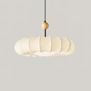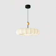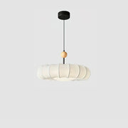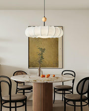 The soft, flowing fabric shade adds a sophisticated layer, while the wood accents add a natural touch. This artistic and elegant design brings an atmosphere of tranquility and elegance to any room, perfect for a dining room, living space or bedroom.