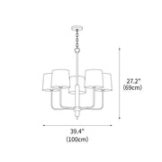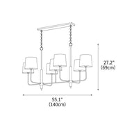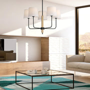 The Aspen Grove Chandelier captures the essence of mid-century design and blends it with modern elegance. It features a central wooden column surrounded by elegant black finish arms, each with a sophisticated white fabric shade. Its understated yet sophisticated style makes it a versatile addition to any home decor.