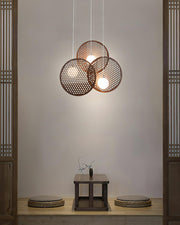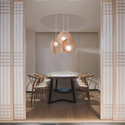 The Bee Plate Chandelier is a unique and artistic lighting fixture that perfectly blends geometric patterns with natural warmth. Inspired by the intricate structure of a beehive, this chandelier features large circular wooden plates that are perforated to allow light to filter through in fascinating patterns. Acrylic spheres behind these plates emit a soft, ambient glow, creating a stunning interplay of light and shadow.