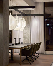 A sleek, contemporary lighting fixture that seamlessly blends modern design with functionality. Crafted from a combination of steel and cocoon material, this pendant light exudes sophistication and style. Its internal framework is constructed of white powder-painted steel, ensuring durability and a clean aesthetic.