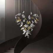 Experience the grandeur of our customizable Leaf Chandelier. Made of anodized gold aluminum, it radiates a warm glow upwards while casting intricate shadows. The integrated LED lights make the brushed finish shimmer in golden tones. With narrow spotlights on the ceiling, it's like walking through a sun-dappled forest.